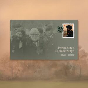 Designed by Larry Burke and Anna Stredulinsky of Burke & Burke, with illustration by Parm Singh, the stamp shows a soldier in reflection beside Singh’s headstone. The background illustration is based on his grave site, which also serves as the stamp’s cancel location.