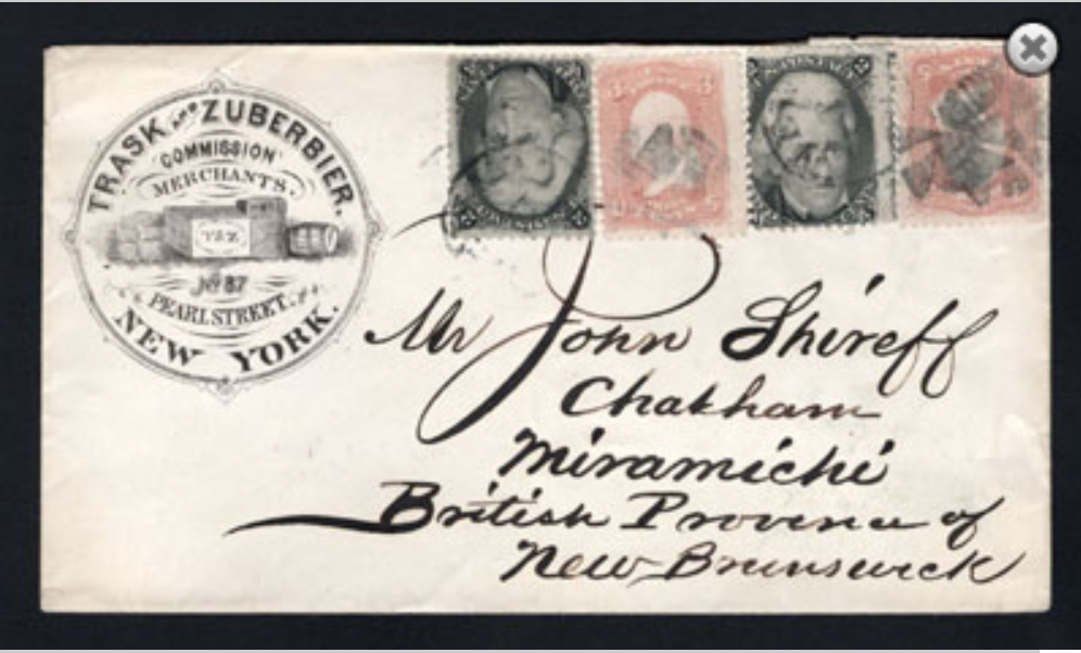 Offered as Lot 588, the 1866 10-cent rate cover was mailed from New York to Chatham, New Brunswick, via Saint John, and features a bold “Trask and Zeberbier Merchants” illustrated design. Franked with two three-cent Washingtons and two two-cent Jacksons paying the 10-cent rate, the cover is tied by cork cancels and a partial circular datestamp. Despite a small portion of the backflap missing, the item remains very fine and attractive, with a $100 estimate and current bidding at C$30.