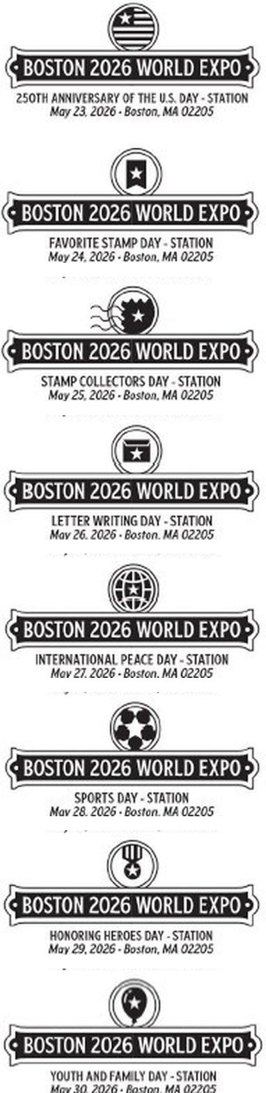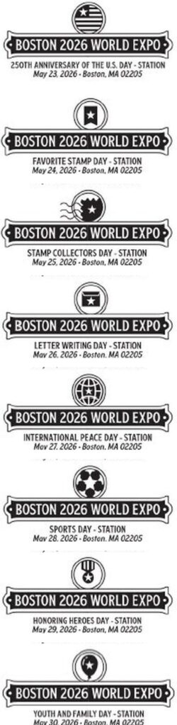 The United States Postal Service has unveiled a series of eight themed daily postmarks for use at the Boston 2026 World Expo, offering collectors a structured and visually consistent set of souvenirs from the international philatelic event.